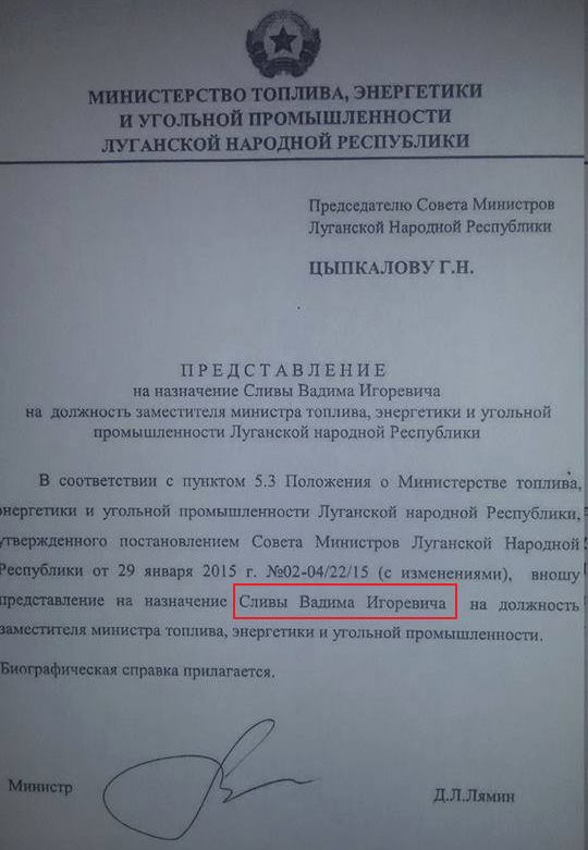 Помимо должности «замминистра угольной промышленности ЛНР» Вадим Слива является еще и генеральным директором государственного предприятия «Луганскуголь», которое подчиняется Министерству угольной промышленности Украины. До войны предприятие было зарегистрировано в Луганске, но после оккупации города пророссийскими бандформированиями сменило юридический адрес и теперь официально находится по адресу Киев, переулок Приборный, 2-А. Таким образом Вадим Слива, еще в январе 2015 года ставший «заместителем министра ЛНР», весь год прекрасно совмещает работу на обе воюющие стороны.