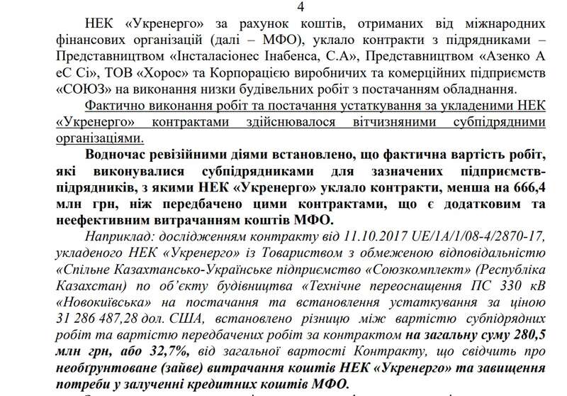 "Установлена разница между стоимостью субподрядных работ и стоимостью предусмотренных работ по контракту на общую сумму 280,5 млн грн, или 32,7%, от общей стоимости контракта, что свидетельствует о необоснованном (лишнем) расходовании средств НЭК "Укрэнерго" и завышении потребности в привлечении кредитных средств МФО", – говорится в отчете аудиторов.