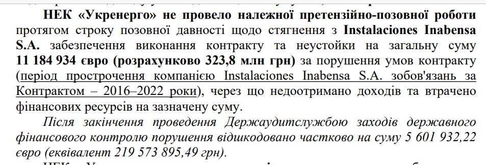 "Отсутствие контроля со стороны "Укрэнерго", и не проведение корректировки стоимости контракта на сумму 183 357 591,28 грн (149 842 050,60 грн + 33 515 540,65 грн), возникшее в результате разницы между средствами, уплаченными НЭК "Укрэнерго" в пользу представительства Inabensa SA и фактической стоимостью работ, выполненных субподрядными организациями, что в свою очередь привело к излишним расходам НЭК "Укрэнерго", — говорится в акте ГАС.