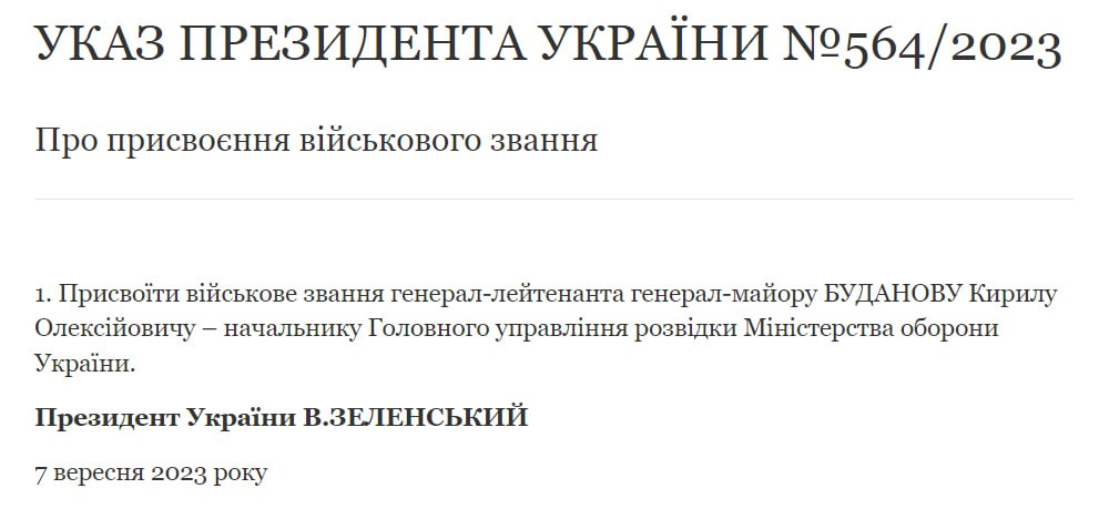 Зеленский присвоил Буданову звание генерал-лейтенанта