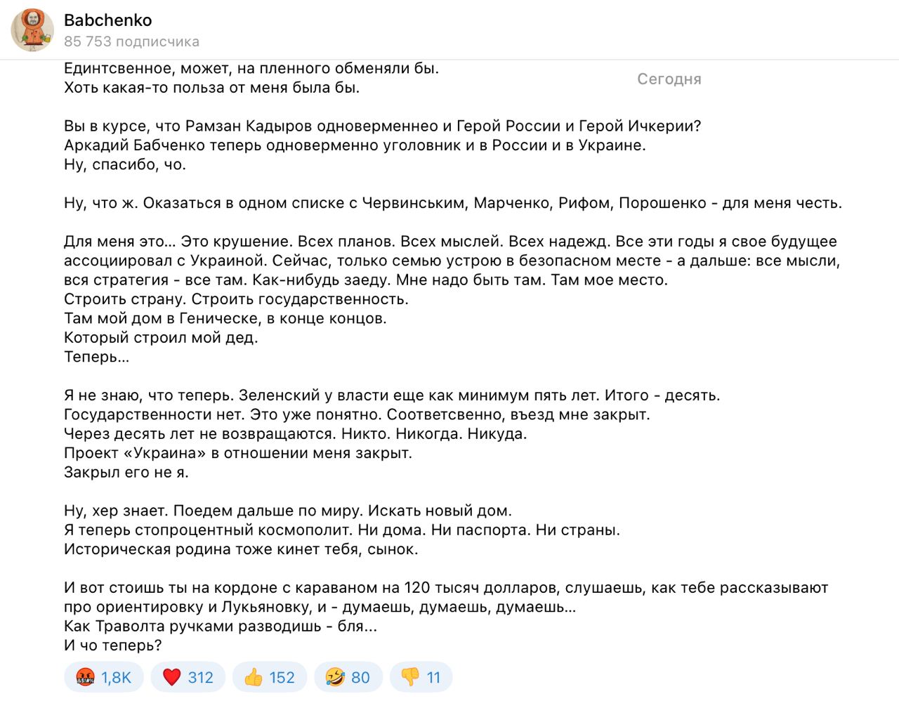 "Что меня экстардируют в Мордор - ни на секунду не сомневаюсь. Гражданин России? Ну так и @издуй. Для меня это крушение. Всех планов. Всех мыслей. Всех надежд. Все эти годы я свое будущее ассоциировал с Украиной", - написал Бабченко.