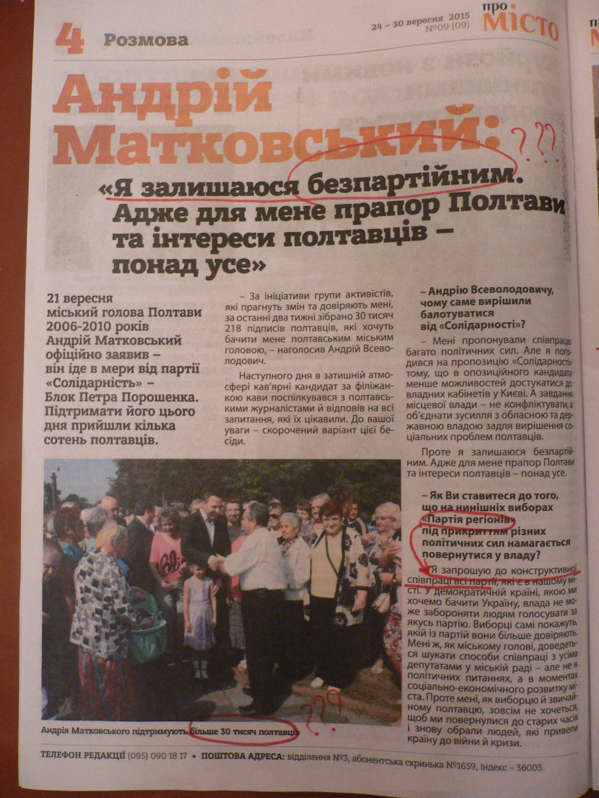 Але найголовніше, про те, що вже зазначав інший активіст: Матковський розуміє, що БЕЗ ПІДКУПУ НЕ МОЖЕ виграти ці місцеві вибори, тому починає маніпулювати думкою читачів, подаючи завідомо неправдиву інформацію. У газеті «Про місто» зазначено, що Матковського підтримують 30 218 полтавців (який точний підрахунок, ні більше, ні менше), але не подано жодних доказів цьому числу. Звідси робимо висновок, що Президента Порошенка підтримують 176 мільйонів українців, а у Китаї живе 23142352 мільярдів китайців. Бо ми так написали. Вірте цьому!