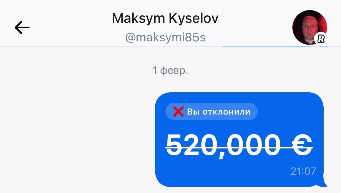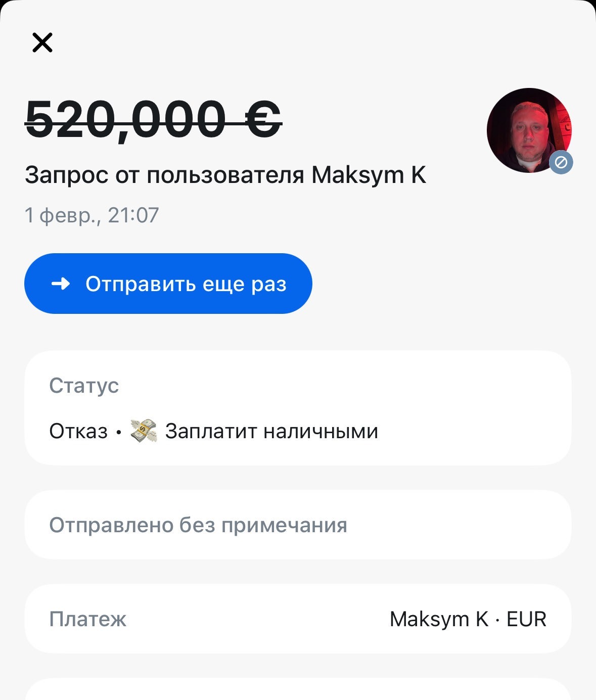 Получив предварительное согласие, Киселёв не откладывая дела в долгий ящик, запросил у Громова Олега 520 тысяч евро через мобильное приложение банка Revolut.