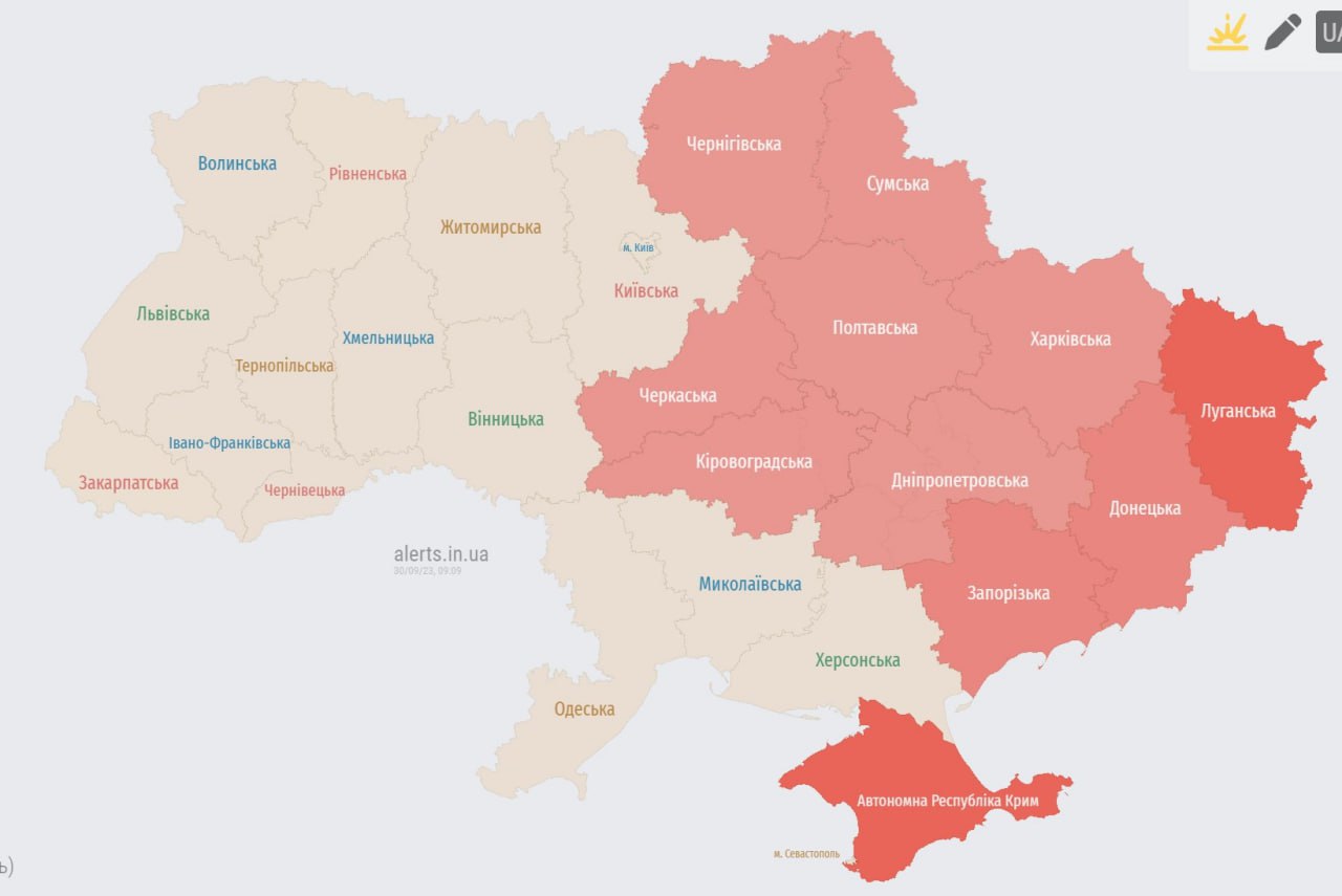 К очерченным на карте областям, попавшим под воздушную тревогу, добавились Херсонская и Николаевская области.