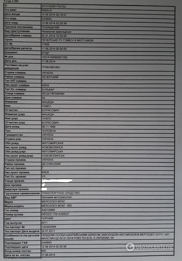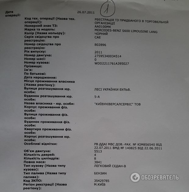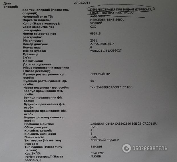 Известно, что автопарк Януковичей был зарегистрирован на ООО "Киевуниверсалсервис". Эта компания выполняла роль ДУСи для Межигорья: на ней был зарегистрирован весь обслуживающий персонал, фирма занималась закупками и даже засветилась в скандальной приватизации охотничьих угодий в Сухолучье. По данным "Обозревателя", 2 апреля 2014-го года в Печерское райуправление обратился замдиректора этого ООО с заявлением о незаконном завладении "неустановленными лицами" автомобилями, в том числе - бронированном Мersedes Benz S600 Limousine Lang черного цвета, объем двигателя —5513 куб.см, 2011 года выпуска, госномер АА 0100 МК, номер шасси WDD 2211761А395027.