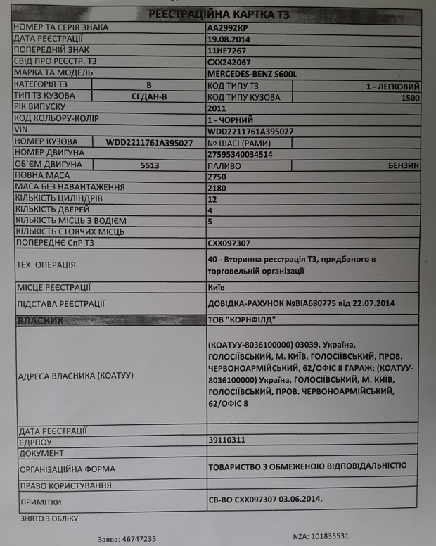 Автопарк Януковичей был зарегистрирован на ООО "Киевуниверсалсервис". Это "общество" являлось первым собственником злополучного Мersedes Benz S600 Limousine Lang.