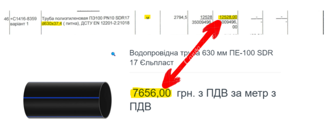 К примеру, «Николаевгорстрой» учел в смете водопроводную трубу ПЭ-100 SDR 17 1000 мм по 42 732 грн/м. На сайте «All Electro » ее предлагают по 21 468 грн/м, но «Нашим деньгам» подтвердили, что на самом деле ее цена несколько выше – 29 518 грн/м. И даже эта цена все равно на 45% ниже сметной. Кроме того, производитель «Трубполимергруп» продает такую трубу по 18 112 грн/м, что более чем вдвое дешевле сметы.
