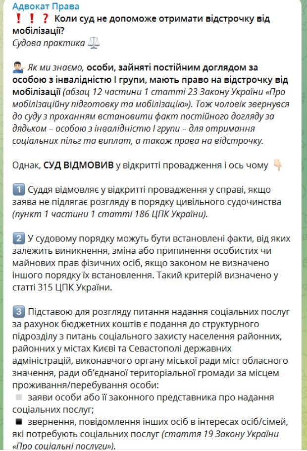 По законодательству Украины, граждане, осуществляющие постоянный уход за инвалидом 1 группы, имеют полное право на отсрочку от мобилизации. Это оговорено 23 Законом Украины "О мобилизационной подготовке и мобилизации". Мужчина, который осуществляет уход за своим дядей, обратился в суд для установления факта постоянного ухода. Это требовалось для получения социальных выплат, а также права на отсрочку.