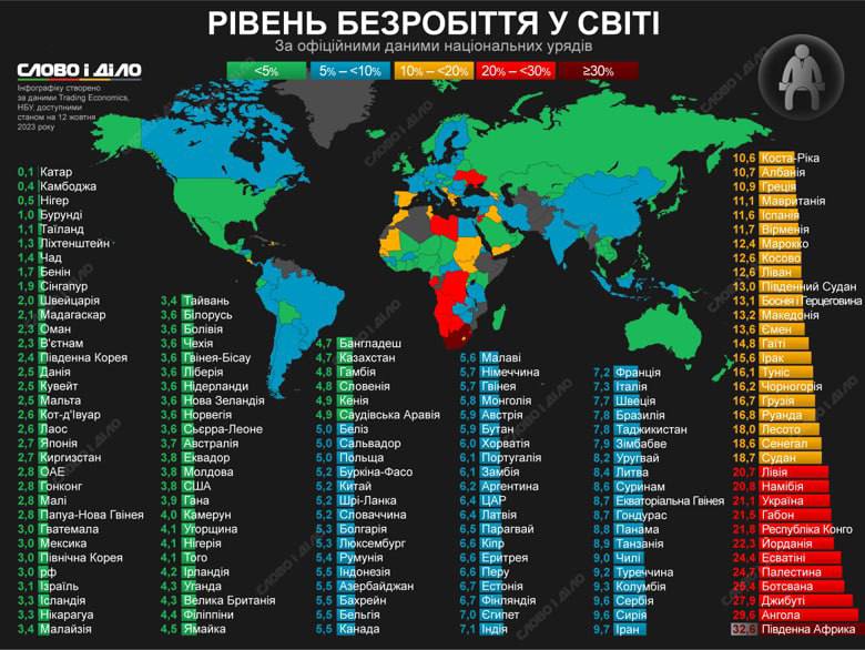 В мире более 200 миллионов безработных. Из-за полномасштабной войны Украина замыкает топ-10 стран с высоким уровнем безработицы: по оценке НБУ — в прошлом году он составлял 21,1%, в этом году ожидается 19%.