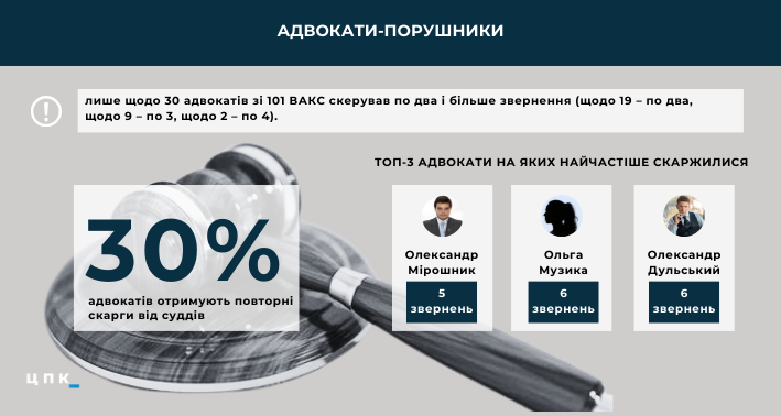 Хорошая новость — большинство нарушений не носят системный характер. К примеру, только по 30 адвокатам из 101 ВАКС направил по два и более обращений (по 19 — по два, по девять — по три, по два — по четыре). Больше всего ВАКС жаловался на адвокатов Александра Мельника – пять обращений, Ольгу Музыку и Александра (Леонидовича) Дульского – по шесть обращений.