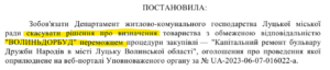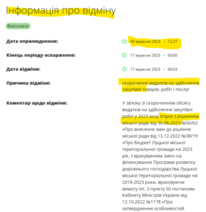 Шаг 8. Через несколько минут в 12:27 заказчик сообщает об отмене всей закупки из-за сокращения расходов на ремонт бульвара Дружбы народов. Соответствующее решение принял Луцкий горсовет 30 августа, то есть через день после того, какой АМКУ приказал гнать «Волыньдорстрой».