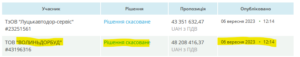Шаг 7. Заказчик выполняет решение АМКУ и 6 сентября в 12.14 обнародует решение об отклонении «Волыньдорстроя».