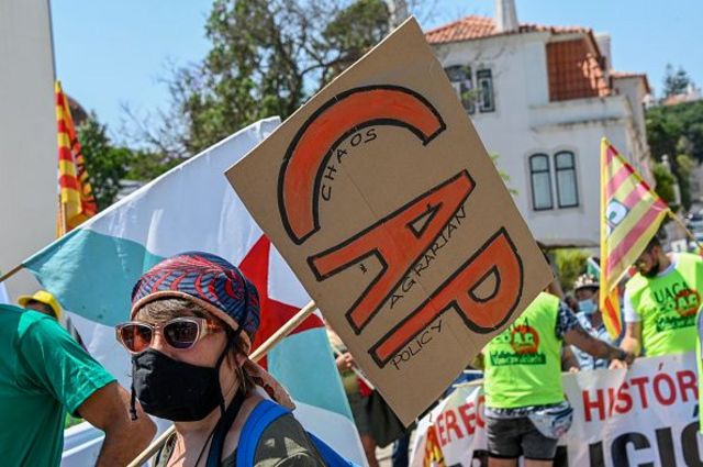 Автор фото, Getty Images / Участники фермерских протестов издеваются над аббревиатурой САР, называя ее хаотической аграрной политикой, вместо общей