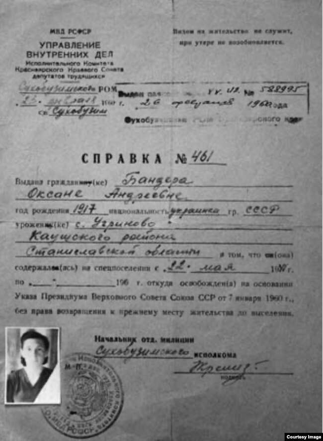 1960 сестры Оксана и Марта Бандеры были освобождены из спецпоселения, но вернуться домой они не могли. В специальной справке Министерства внутренних дел написано: "без права возвращения к прежнему месту жительства".
