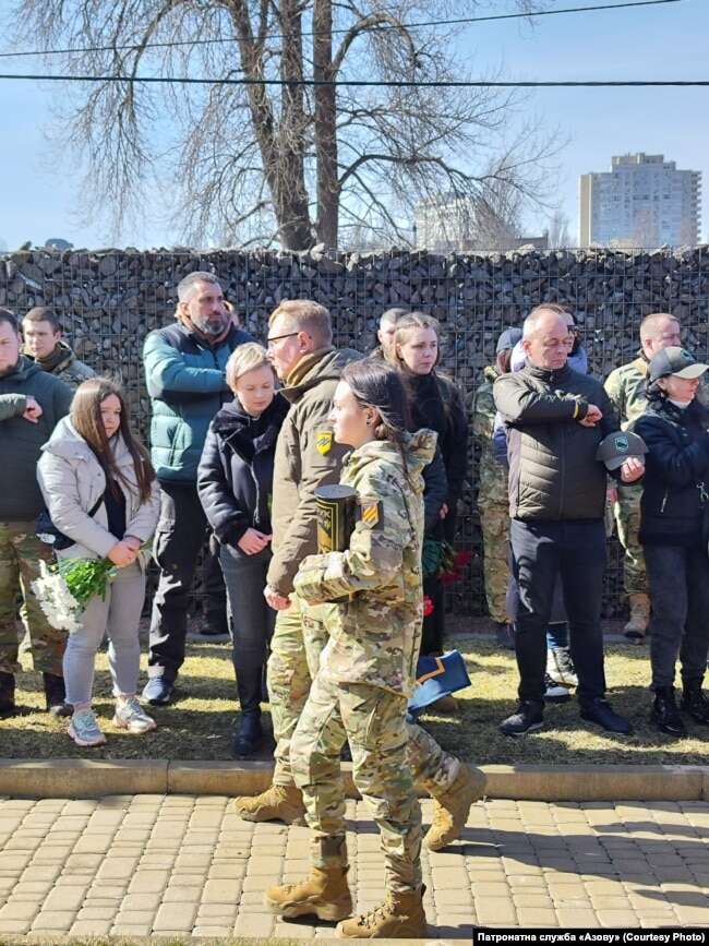 Захоронение праха бойца и идеолога "Азова" Николая Крука. Урну несет его жена Ольга. Март 2023 года