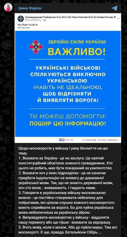 Теги: ПутинРоссияНапад Росії на УкраїнуВойнаВійнаФарион ИринаФаріон ІринаСкандалЗСУВСУРосійська моваРусский языкУкраїнська моваУкраинский язык