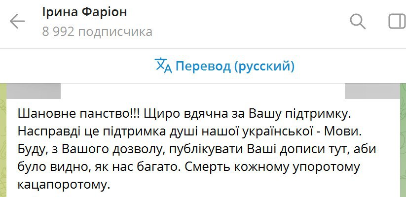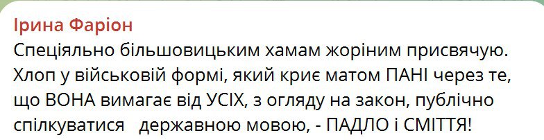 "Смерть каждому упоротому кацапоротому", – заключила Фарион.
