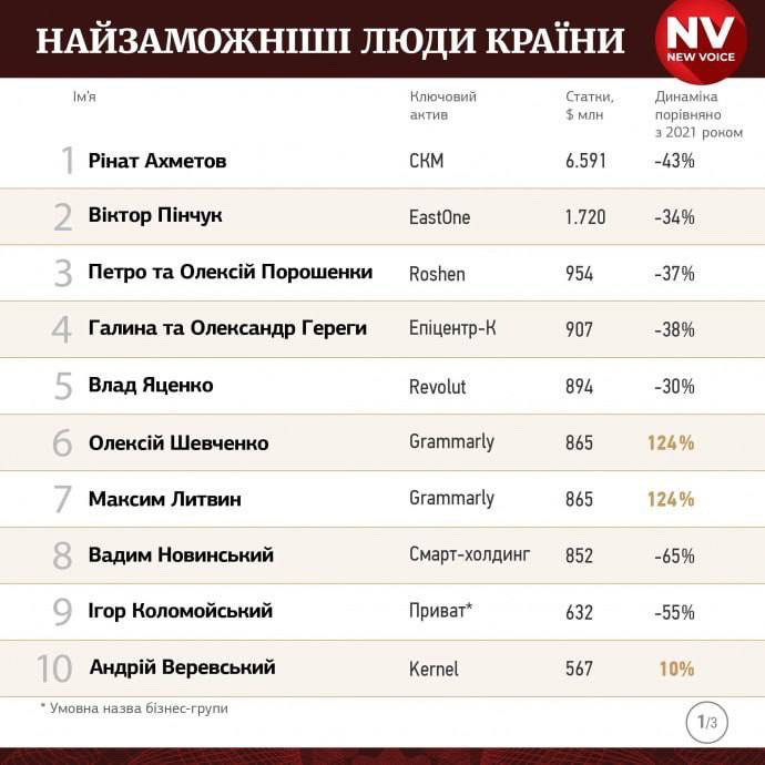 На первом месте – Ринат Ахметов (СКМ) с состоянием 6,59 млрд долларов – по сравнению с 2022 годом они упали на 43%.