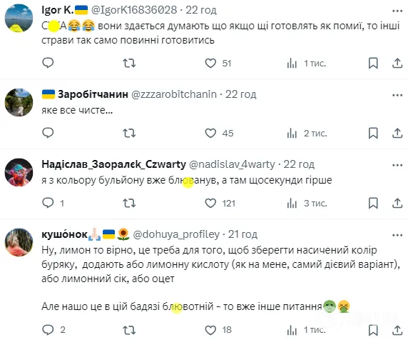 Женщина с уверенностью рассказала зрителям, что борщ надо готовить так: в бульон (он у нее получился грязного беловатого цвета) хлюпнуть ложку аджики, дальше закинуть нашинкованную капусту, картофель, морковь, лук (никакие овощи россиянка не пассировала) . "Секретным ингредиентом" блоггерша назвала ломтики лимона. Последним в варево пошла свекла – ее "хозяйка" хоть как-то порезать не смогла.