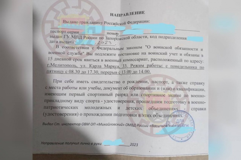 Россияне на оккупированных территориях Запорожской области продолжают заниматься постановкой мужчин на военный учет. Это происходит в рамках скрытой мобилизации.