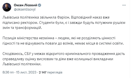 Фарион уволили с должности профессора Львовского политехнического университета, сообщил министр образования Лесной.