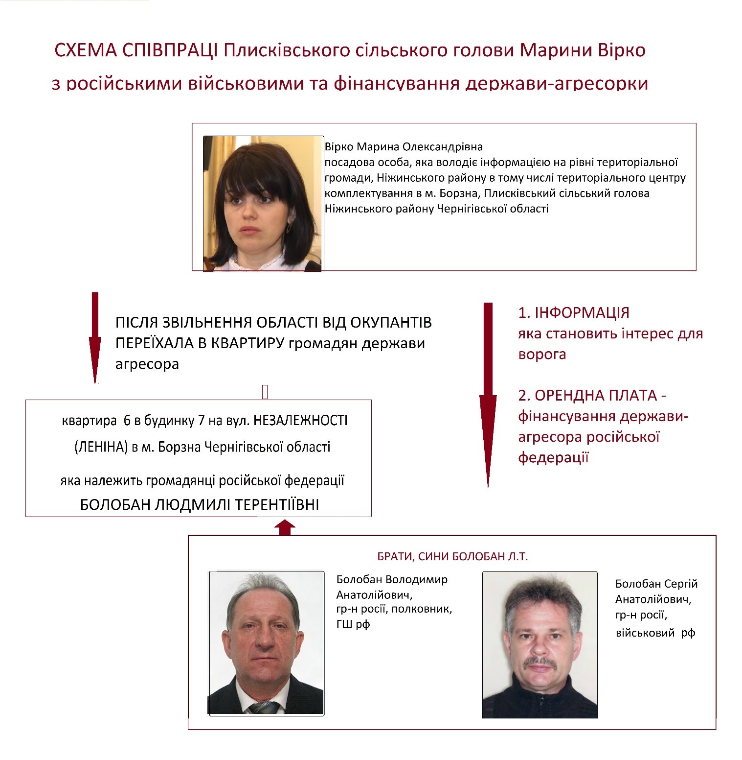 Как объясняют соседи, квартирой распоряжается сын владелицы, российский военный полковник Владимир Болобан через знакомых и родных, проживающих в г. Борзна. То есть российский полковник Болобан владеет сетью осведомителей, от которых может получать информацию об обстановке в городе Борзна.