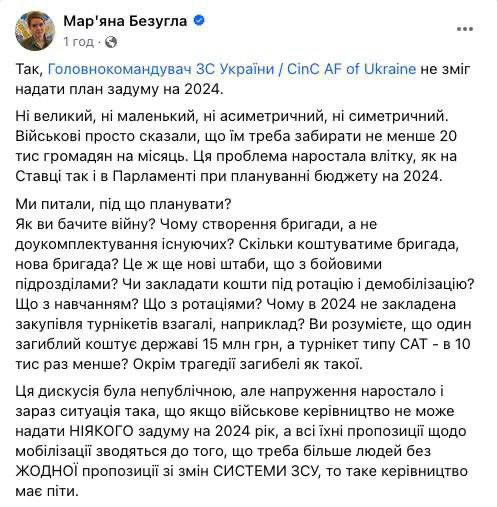 По ее словам, главнокомандующий не предоставил план действий на 2024 год, а также у чиновничьего аппарата возникло множество вопросов к деятельности руководителя войск.