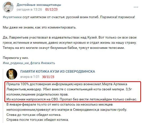 "Поступила 100% достоверная информация через военкомат. Живодер Артемко Лаврентьев мертв. Убил вместе с сожительницей кота своей матери. 3,5 года колонии, лишение родительских прав. Из колонии напросился на "СВО". Пропал без вести летом, найден только сейчас. В январе-феврале то, что от него осталось за несколько месяцев непогребенным, привезут его матери в Северодвинск, в закрытом гробу", - написали в местной зоозащитной группе.