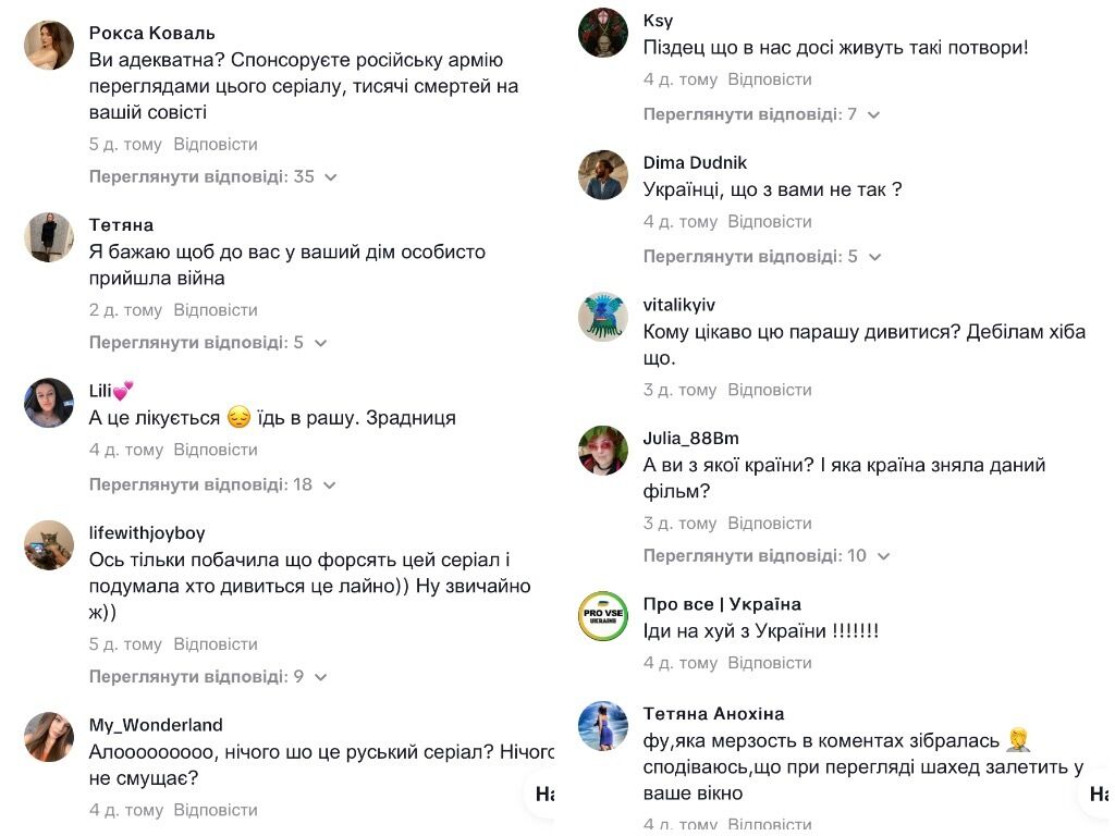 "Вы адекватна? Спонсируете российскую армию...", "Если люди даже во время войны московскую рыгальню смотрят, то это клиника", "Лучше сводку с фронта посмотри", "А это лечится? Лучше в рашку поезжай. Предательница", "Алло, а ничего, что это русский сериал? Ничего не смущает?" – оставляют комментаторы.