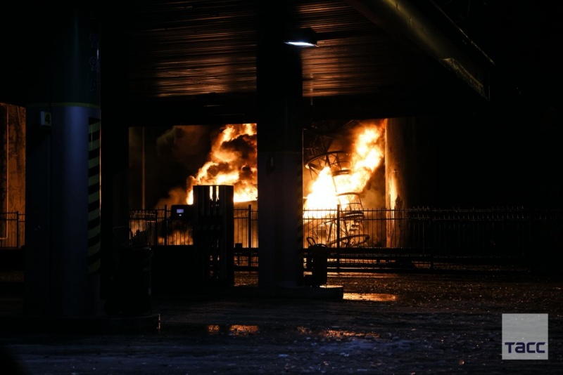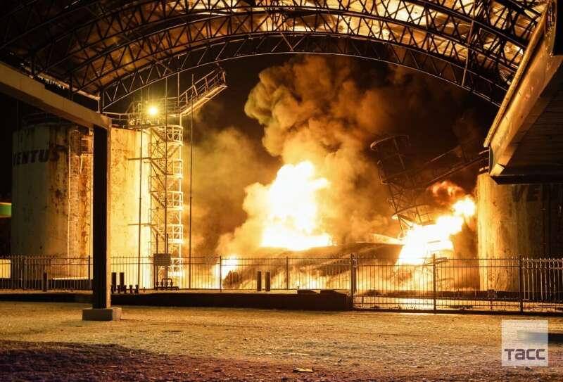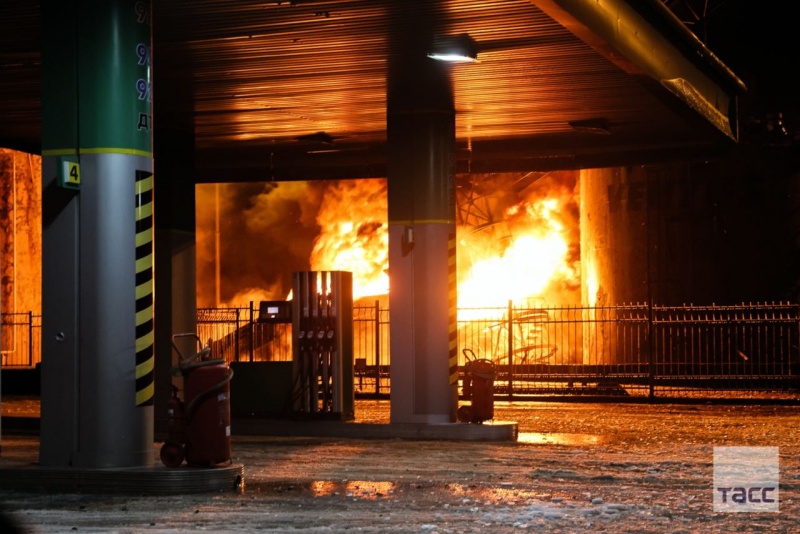 "ТАСС" опубликовало фотографии с места "прилета". На фото можно увидеть сильный пожар на нефтебазе.