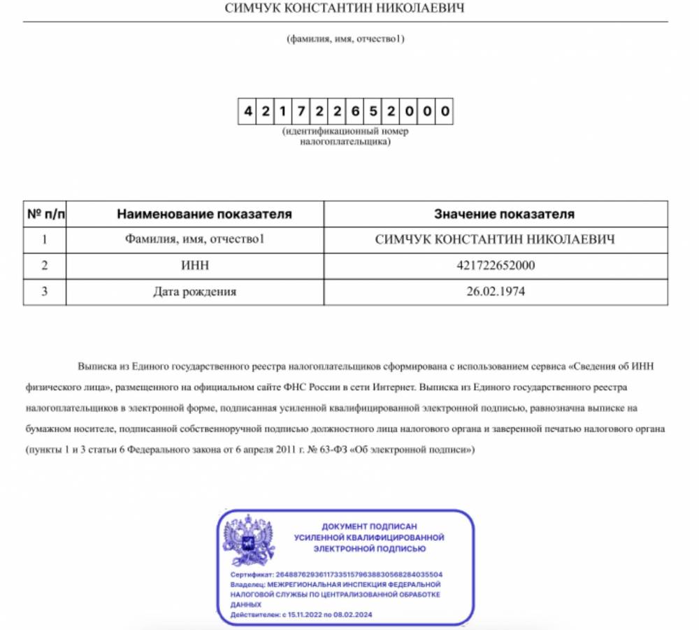 Действующий директор ДЮСШ ХК «Сокол Киев» Симчук якобы с 2004 года и по настоящее время является гражданином России. Свидетельством этого, согласно предоставленной информации, является копия паспорта гражданина России и выписки из единого реестра налогоплательщиков в отношении физических лиц по состоянию на 12 сентября 2023 года.
