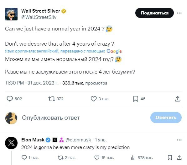 Так он прокомментировал публикацию пользователя Х, где тот вопрошает, "может ли 2024 быть нормальным?" и "не заслужили ли мы этого после 4 лет безумия".