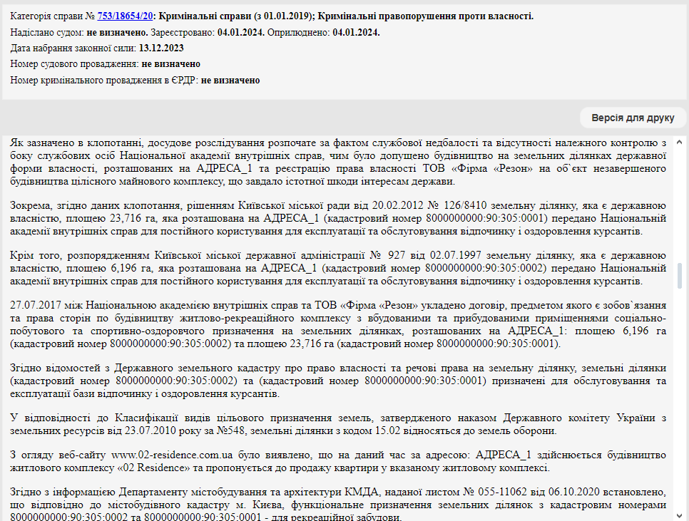 Отметим, 1 ноября 2023 Дарницкий районный суд Киева почему-то отказал прокурорам Дарницкой окружной прокуратуры в наложении ареста на два участка по вышеуказанному адресу, которые находятся в постоянном пользовании Национальной академии внутренних дел (НАВД). Это участки с кадастровыми номерами 8000000000:90:305:0001 (площадь 23,7 га, целевое назначение – для строительства и обслуживания объектов рекреационного назначения, для эксплуатации и обслуживания базы отдыха и оздоровления курсантов) и 8000000000:90:305:0 (Площадь – 6,19 га, для размещения и постоянной деятельности Национальной гвардии Украины, для обслуживания и эксплуатации базы отдыха и оздоровления курсантов).