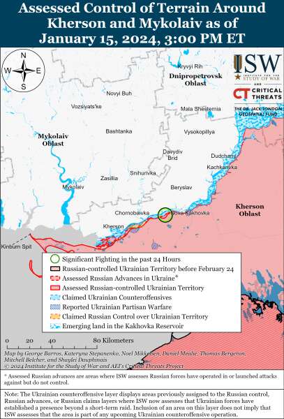 Украинские войска сохраняют свои позиции на восточном берегу Херсонской области по состоянию на 15 января, а ограниченные позиционные бои продолжались возле Крынков.