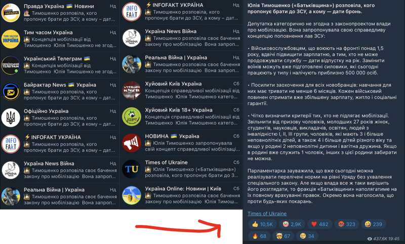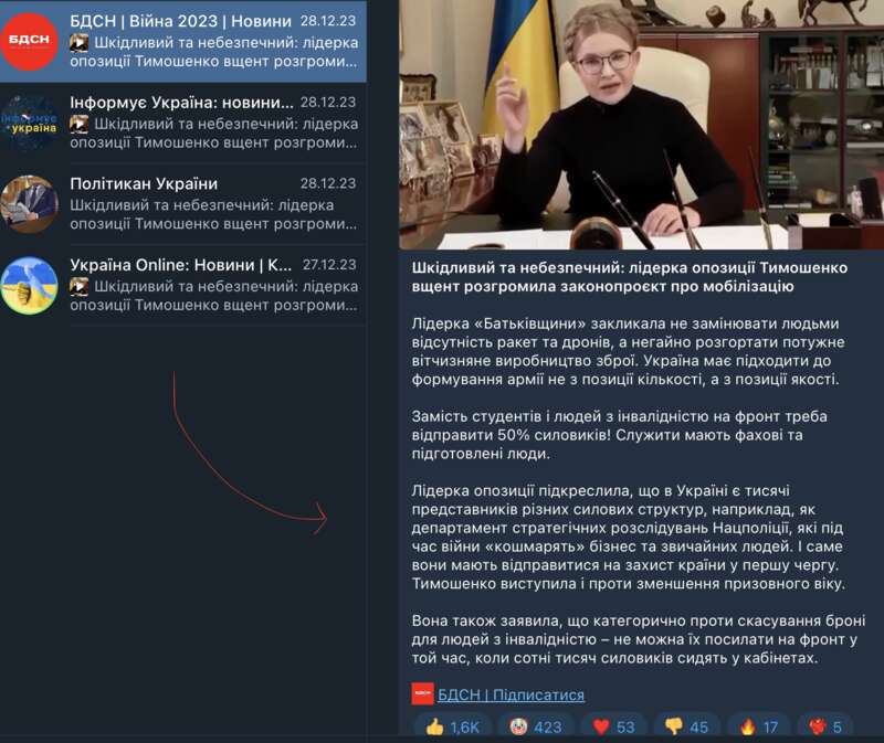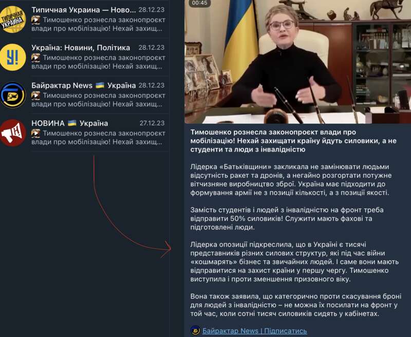 Несколькими днями ранее пиарщики Тимошенко забросили в анонимные телеги ее заявление о том, что законопроект о мобилизации вреден и опасен, поэтому, по словам анонимных Телеграм-каналов, "лидер оппозиции полностью разгромила законопроект".