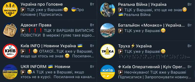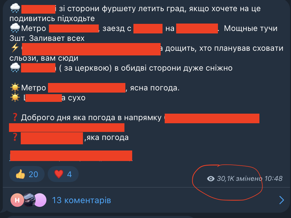 В определенный момент предприимчивые лица активизировали деятельность нишевых Телеграм-групп, информирующих о наличии блокпостов и присутствии представителей ТЦК в тех или иных местах. Только на одну такую локальную киевскую группу, созданную 27 декабря 2023 года, в течение двух недель подписались 52 тысячи пользователей. В этой группе информация о наличии военных и "раздаче повесток" подается с помощью игры слов, что представляет прогноз погоды.