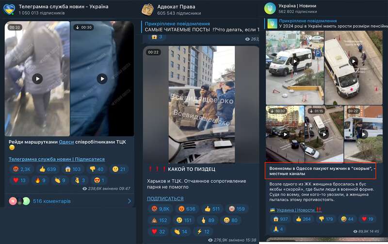 Тема работы ТЦК и "упаковка в бусик" – одна из распространенных в анонимных Телеграм-каналах. Они репостят видео, где якобы представители "военкоматов" силой затягивают мужчин в микроавтобусы против их воли. Понятно, что тексты к таким видео рассказывают об обмане со стороны ТЦК, о том, как мужчины пытаются сбежать, и сопровождаются эмоциональной лексикой.