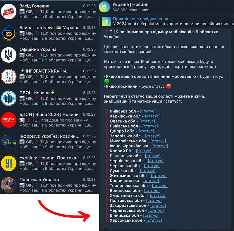 Администраторы таких каналов размещали одинаковое ложное сообщение о том, что "в девяти областях Украины ТЦК отменили мобилизацию", а "в остальных 15 областях набор будет увеличен ровно в четыре раза". Узнать, какие именно области входят в первый или второй перечень, можно, только присоединившись к предложенным закрытым группам.