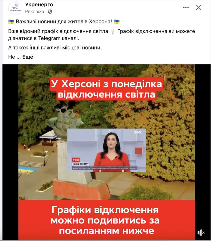 Один из каналов Херсонской области из этой сети также раскручивали в Фейсбуке на фейковой странице "Укрэнерго", где якобы сообщали об отключении света в Херсоне. Понятно, что никакого отключения света тогда не ожидалось и это было лишь еще одним способом накрутить количество просмотров "телег" с помощью чувствительной темы.