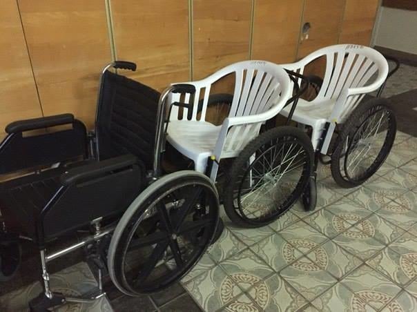 "Киевская больница номер 12... Я минут 10 стояла, смотрела и не могла понять, как это и зачем. Потом до меня дошло, что это самодельные инвалидные коляски", - прокомментировала снимок автор фото.