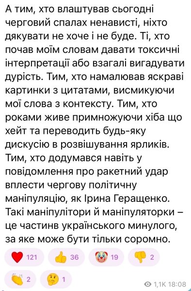 "Тем, кто начал моим словам давать токсичные интерпретации или вообще придумывать глупость. Тем, кто нарисовал яркие картинки с цитатами, выдергивая мои слова из контекста. Тем, кто годами живет умножая разве что хейт и переводит любую дискуссию в развешивание ярлыков", – говорит Лещенко.