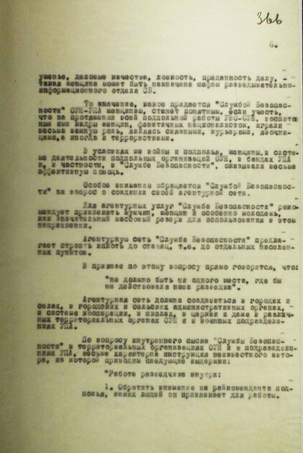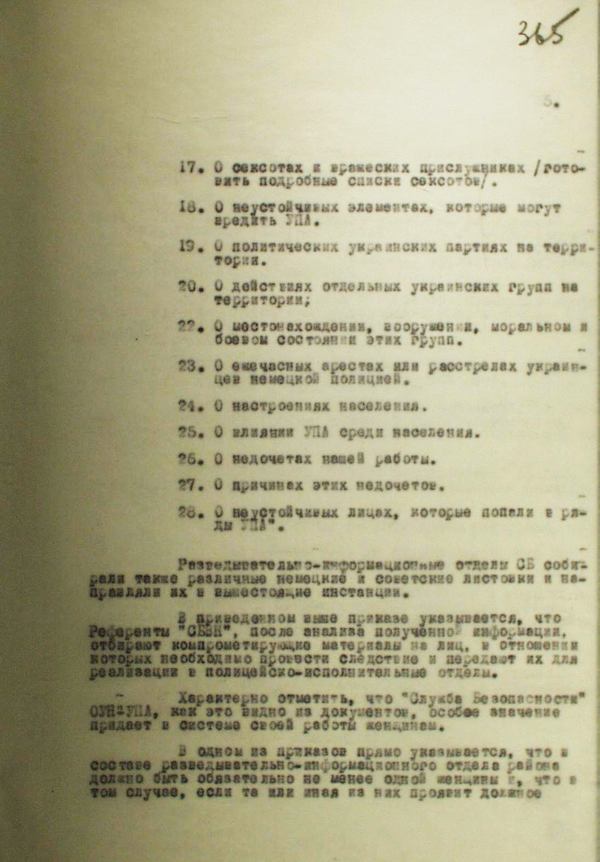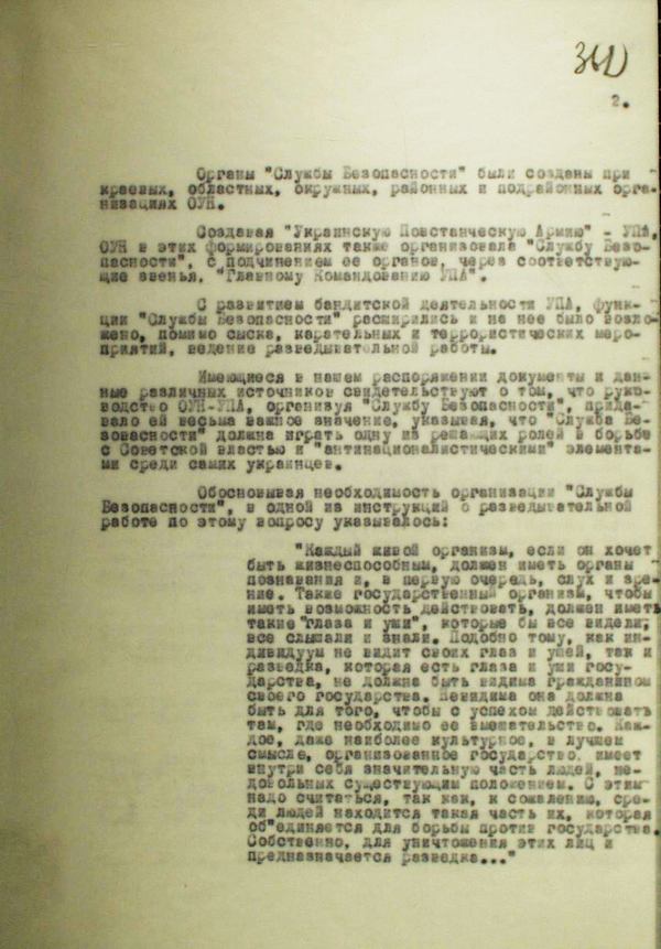 Так, в мае 1944 года за подписью народного комиссара государственной безопасности УССР Сергея Савченко была подготовлена докладная записка под названием «О Службе Безопасности» ОУН–УПА, о структуре и методах ее работы». Целью этого документа было довести до сведения всех подразделений НКГБ, которые в тот период развернули работу по уничтожению украинского организованного подполья, как устроена эта специальная служба УПА, как ей удается узнавать все, что происходит на подконтрольных территориях, и почему так нелегко ей противодействовать.