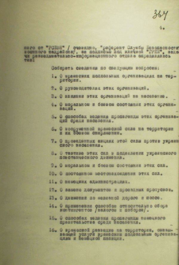 В «Секретном приказе № 1» от 13.09.1943 года, подписанном референтом СБ под псевдонимом «Гром», приводятся задачи отдела: