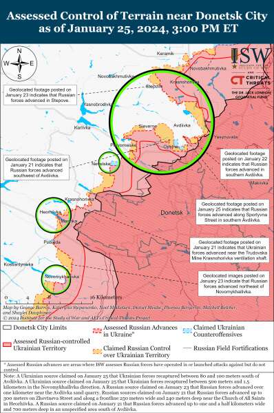 Анатилики ISW утверждают, что российские войска, похоже, готовятся попытаться прорваться через Авдеевку после того, как им не удалось окружить населенный пункт. Оккупанты недавно сосредоточили наступательные операции на южном жилом районе города.