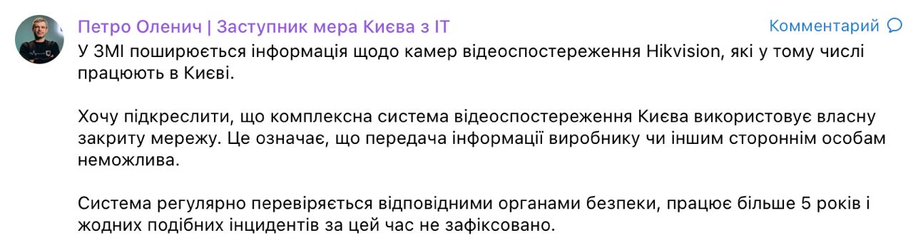 "Хочу подчеркнуть, что комплексная система видеонаблюдения Киева использует собственную закрытую сеть. Это означает, что передача информации производителю или другим посторонним лицам невозможна. Система регулярно проверяется соответствующими органами безопасности, работает более 5 лет и никаких подобных инцидентов за это время не зафиксировано", - пишет заммэра Киева по вопросам IT Петр Оленич.