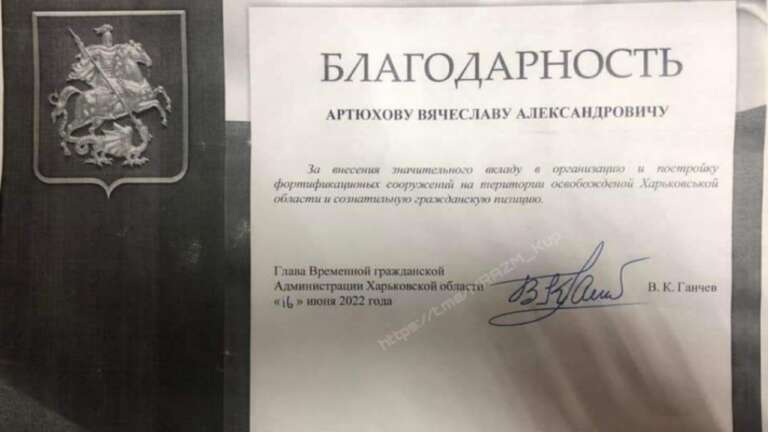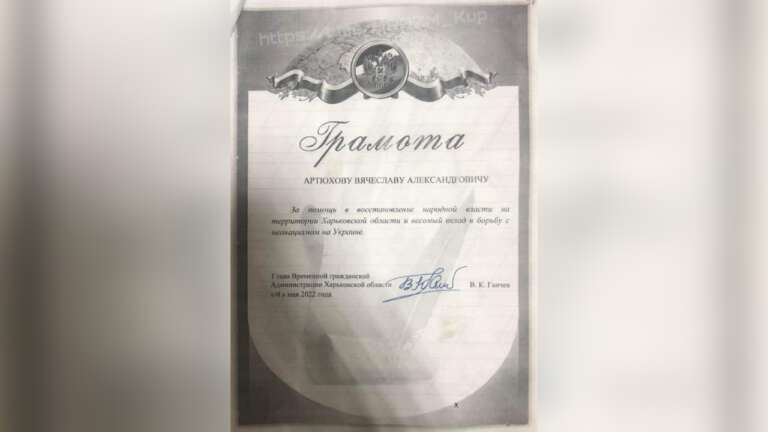 Фото якобы грамоты Артюхову от оккупационных властей. Фото: телеграмм-канал "MARAZM"
