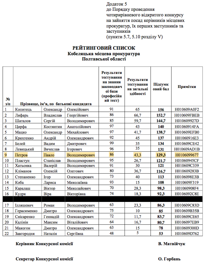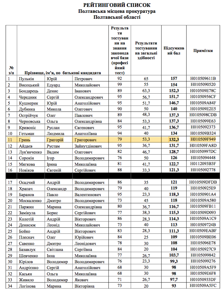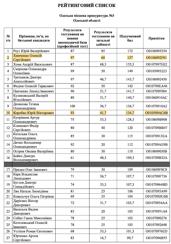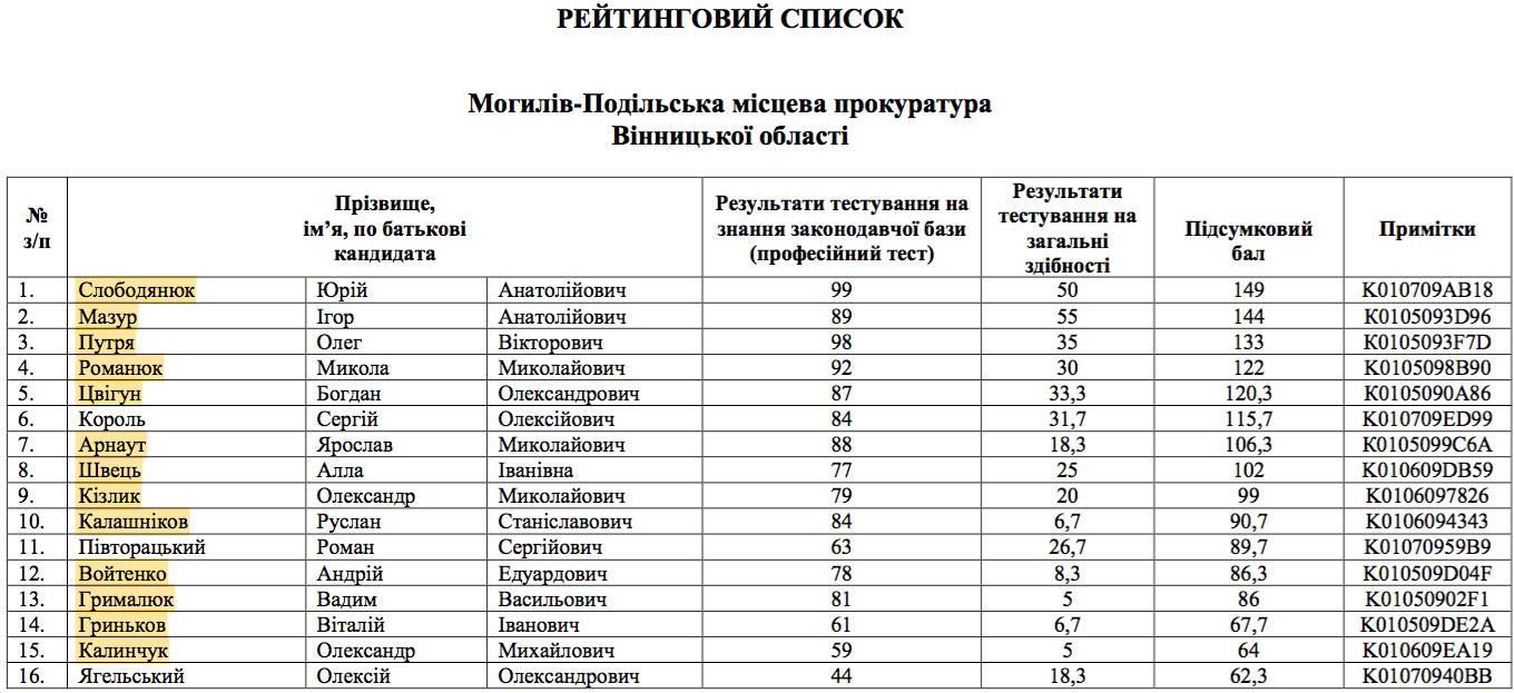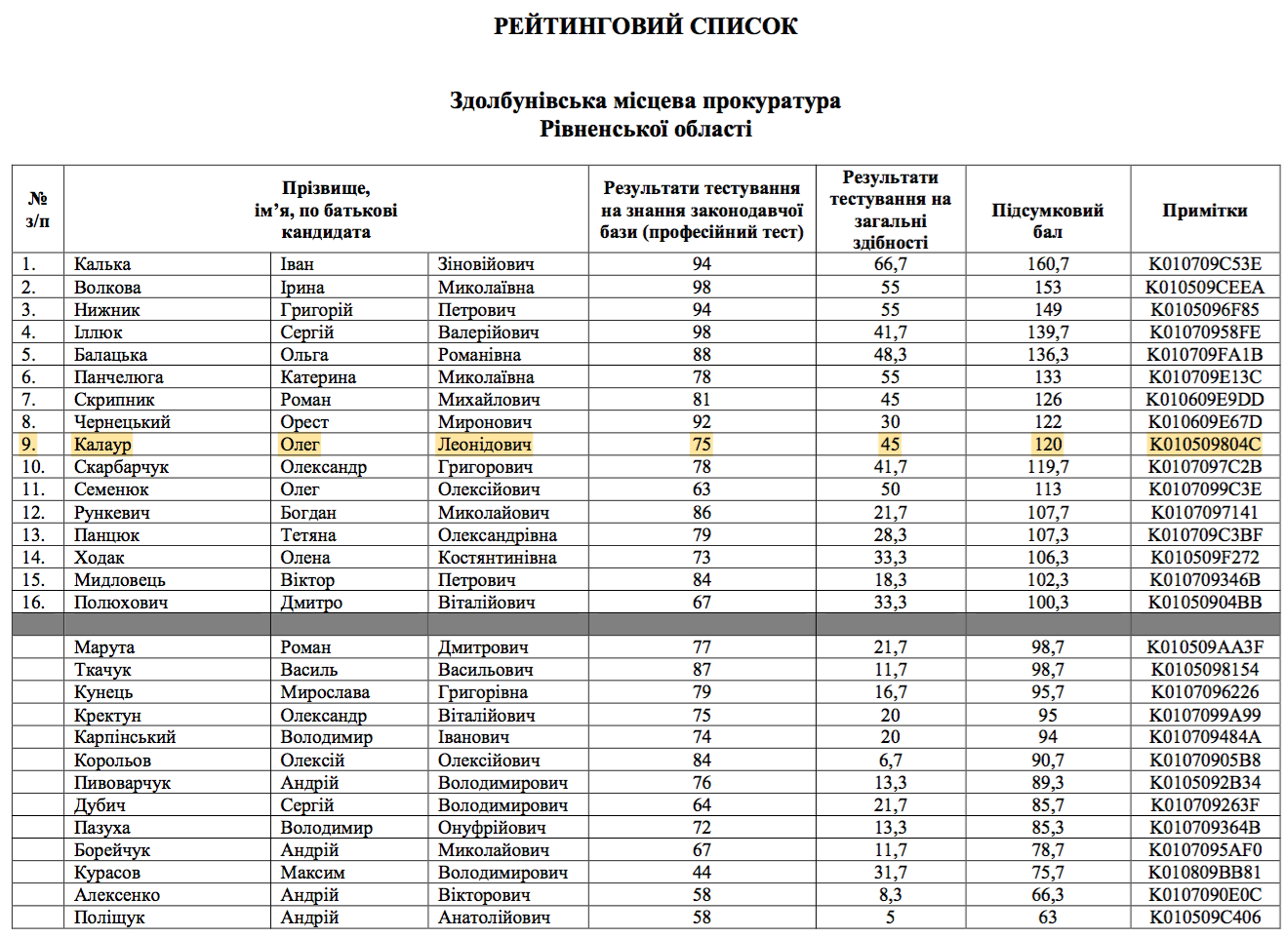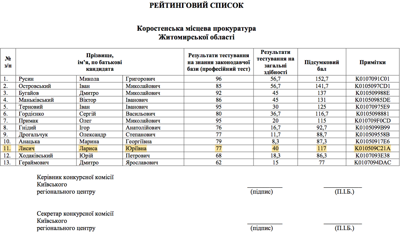 Изучая списки, мы обнаружили и подтасовки с рейтингом. Так, в списке Коростенской местной прокуратуры Житомирской области кандидата с итоговым баллом 117 опустили с его законного 5-го места на 11-е.
