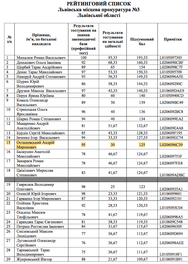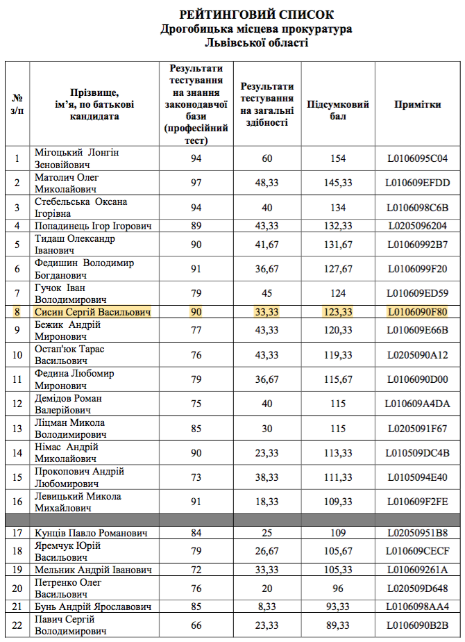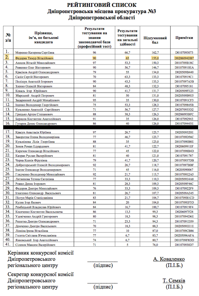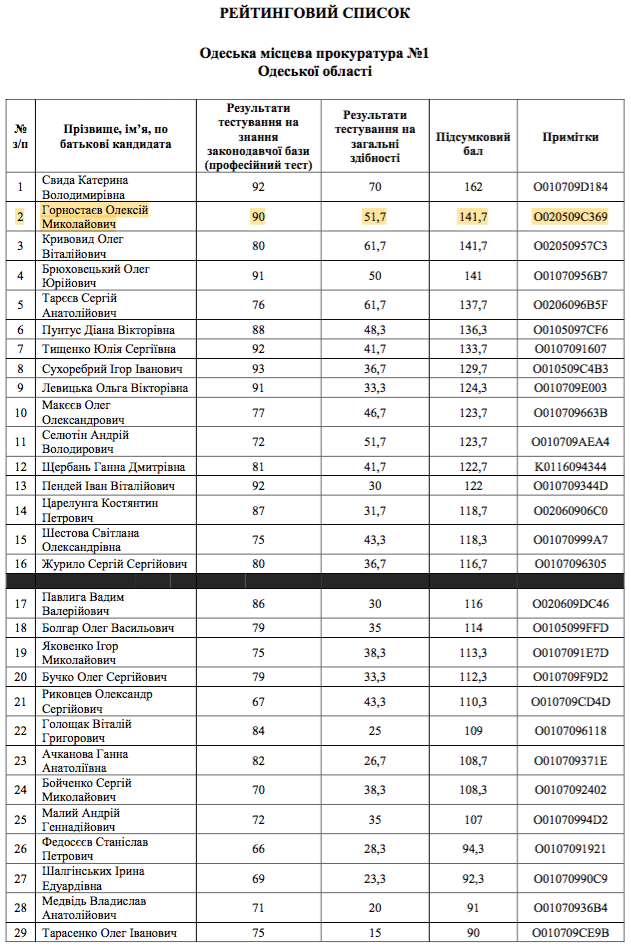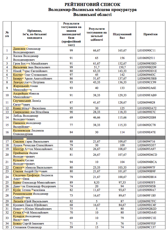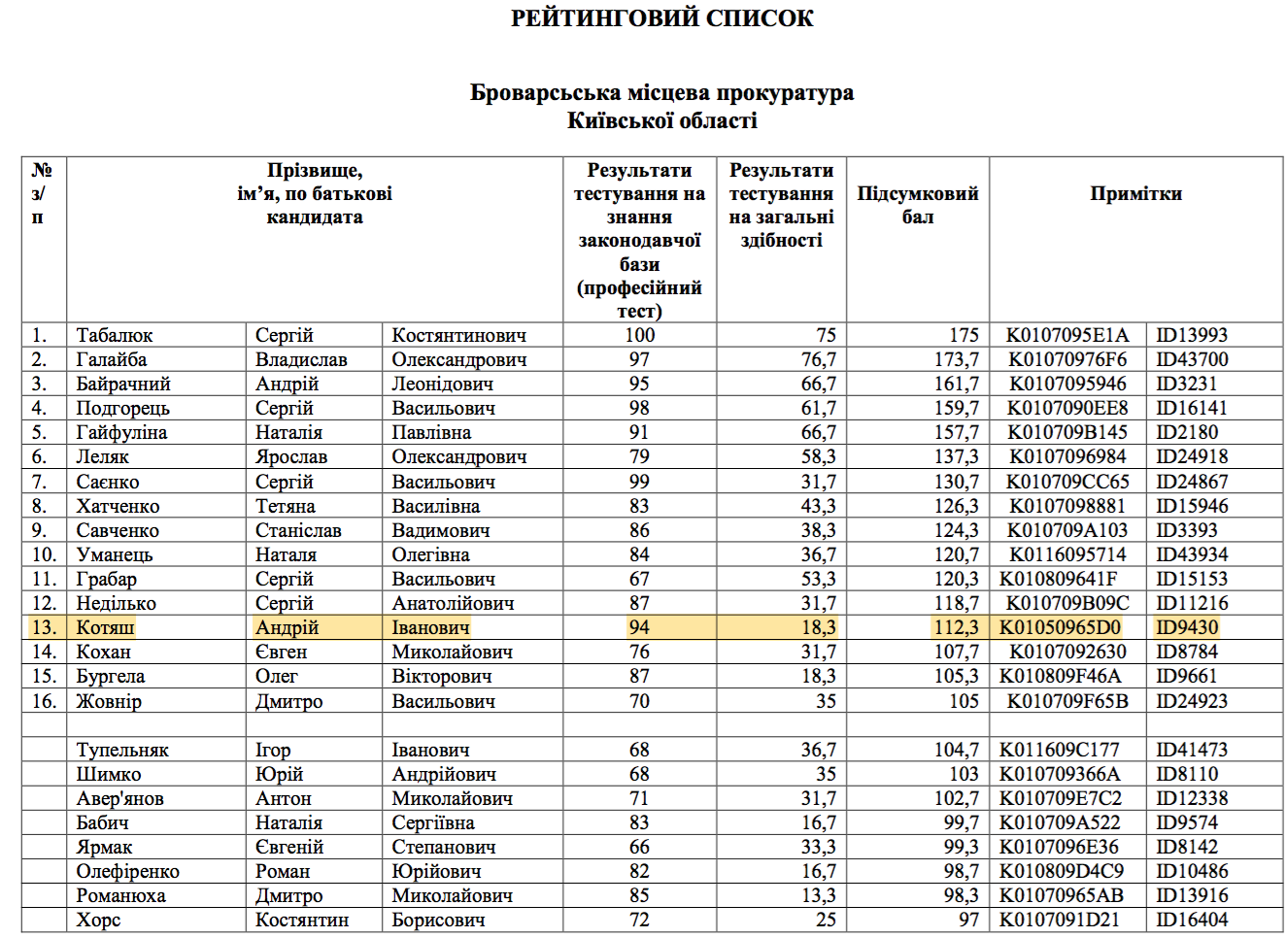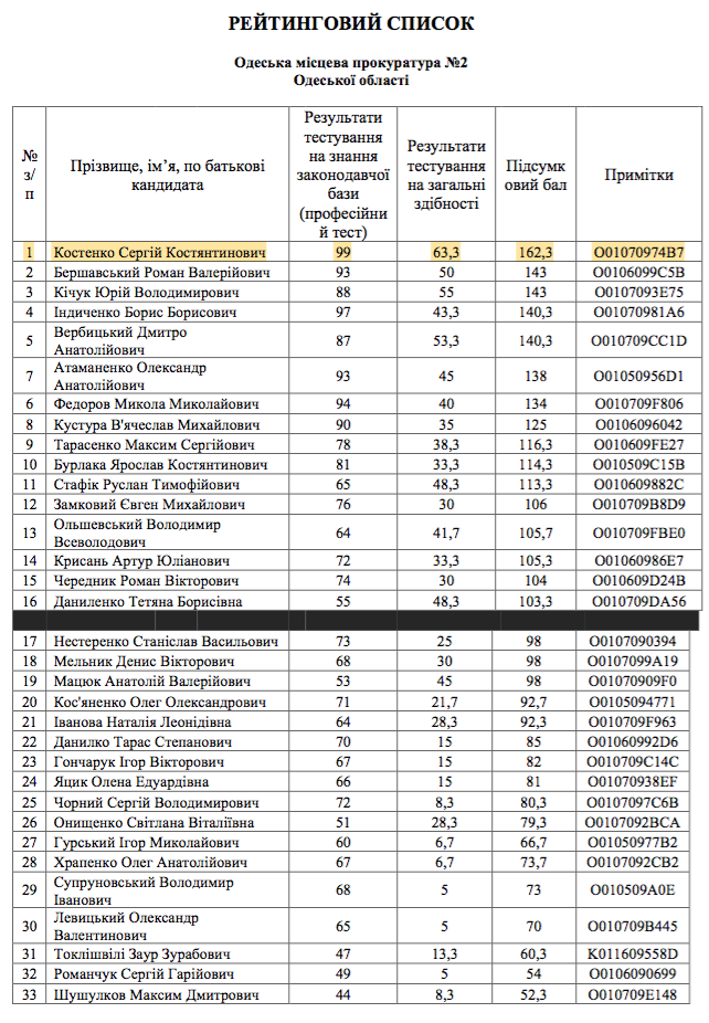 Изучая списки, мы обнаружили и подтасовки с рейтингом. Так, в списке Коростенской местной прокуратуры Житомирской области кандидата с итоговым баллом 117 опустили с его законного 5-го места на 11-е.
