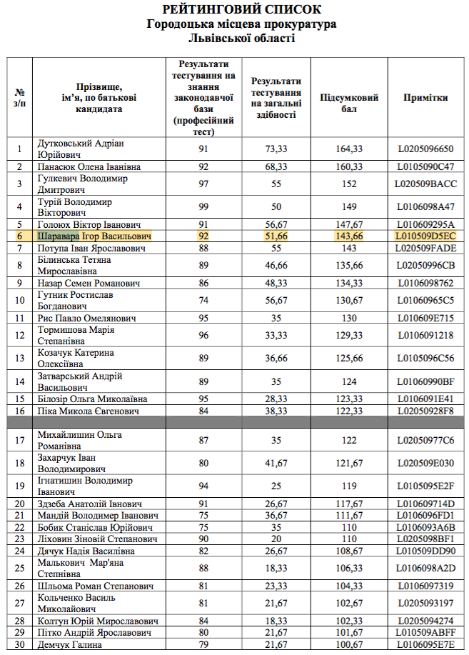 Уверенно к руководящей должности Городоцкой местной прокуратуры Львовской области движется старший прокурор Львова Игорь Шаровара – сын Василия Шаравары, люстрированный первый заместитель прокурора Тернопольской области (экс-заместитель прокурора Хмельницкой области, экс-прокурор Тернополя). Игорь по результатом двух тестов набрал 143,66 баллов и занял 6-е место в рейтинге.