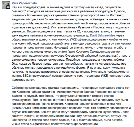 Ярким примером действий, а не слов по отношению к реформе является, то, что Сакварелидзе лично представлял Костенко на должность прокурора Суворовской районной прокуратуры. Хитрая борьба получается с коррупцией у грузина-реформатора. Здесь, перед СМИ, Сакварелидзе грозится быть грозой коррупционеров, а вот тут уже, как прокурор Одесской области, представляет коррупционера Костенко в новой должности.